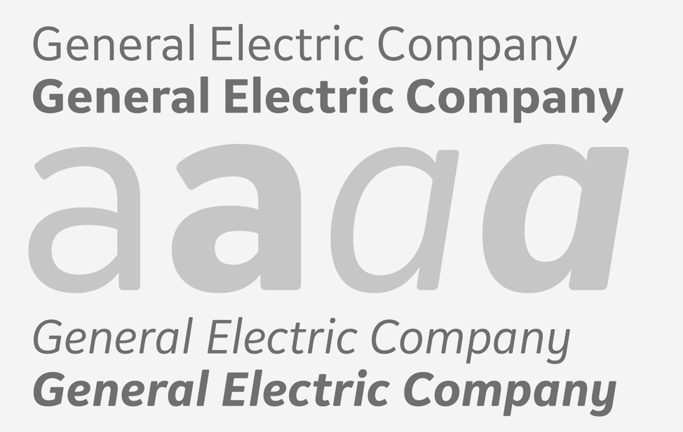 In 2013, we were approached by Wolff Olins to design a new type family in conjunction with Mike Abbink for their client General Electric. GE has already been using a custom headline typeface since 2002 — GE Inspira, also co-designed by Mike Abbink. This earlier typeface served as a starting point for the new family, which is tailored to the use in small body copy and on screen.