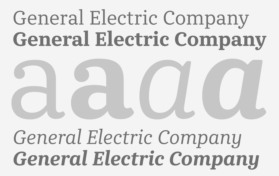 The serif family follows the structure of the sans-serif but, furthermore, takes inspiration from the Clarendons of the 19th century — a nod to the time when GE was founded. It features a moderate stroke contrast, sturdy slab serifs, and prominent ball terminals. The slightly rounded corners help tie the series together and underline its handsome appearance.