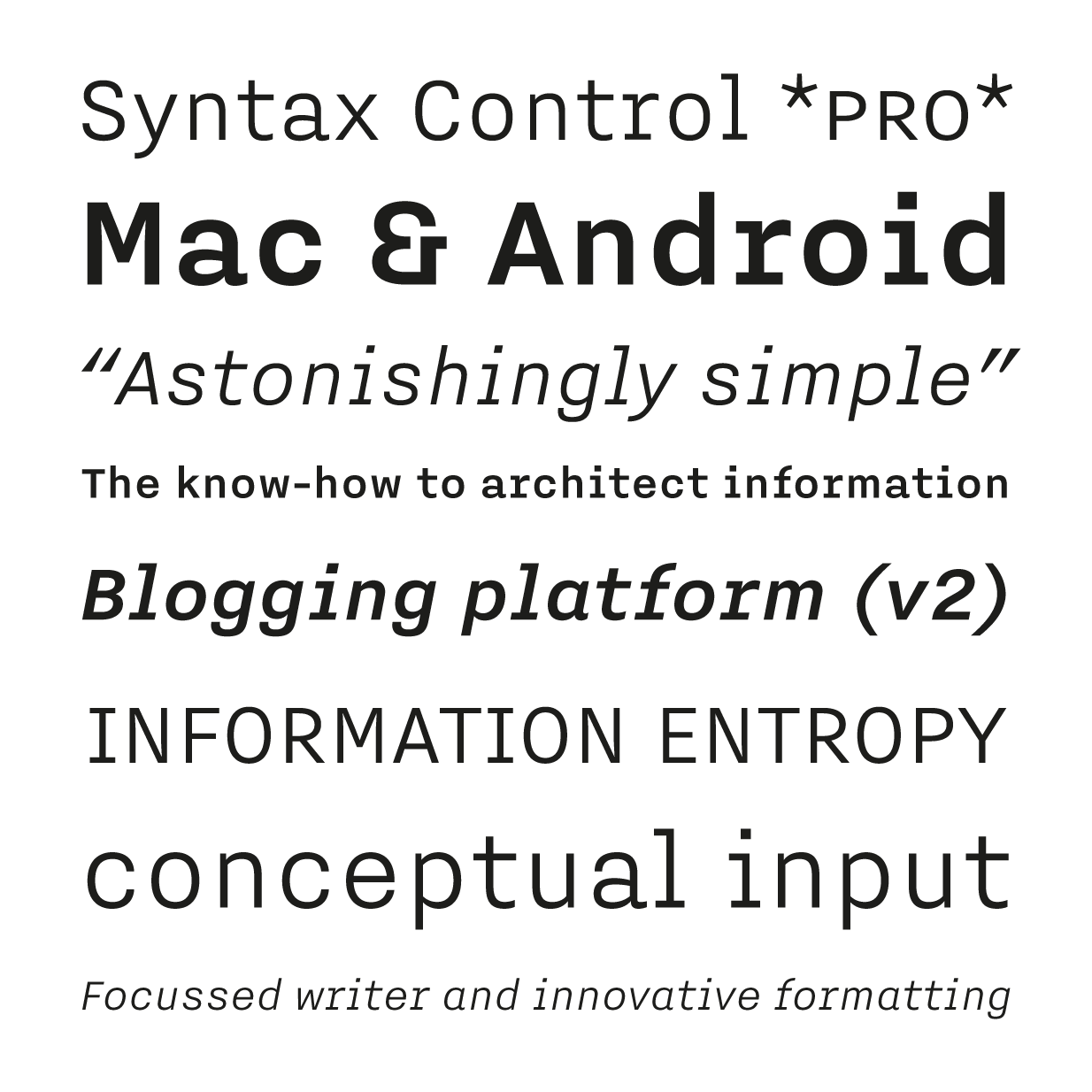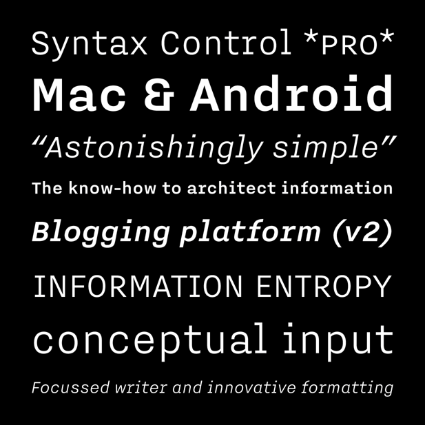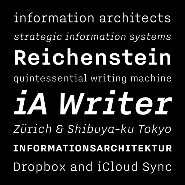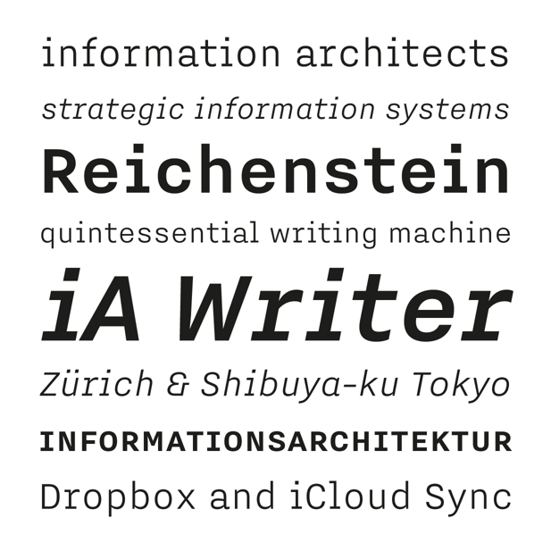 Information Architects — a design studio Bold Monday already consulted for regarding their iA Writer applications — commissioned this special version of Nitti for their new corporate design and website. While our regular Nitti is monospaced, this custom family is proportionally spaced and consists of two weights with italics and small caps, giving it a natural, nonchalant, but more literary appearance.