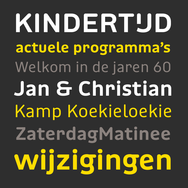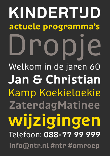NTR Speciaal is a custom typeface in two weights, designed for the NTR. NTR was created in 2010, following the merger of the Nederlandse Programma Stichting (NPS) and two educational broadcasters, Televisie Academie (Teleac) and the Radio Volksuniversiteit (RVU). The contemporary sans-serif typeface with its sharp but also softened, rounded terminals exudes an approachable, personable atmosphere, while working perfectly together with the NTR logo.