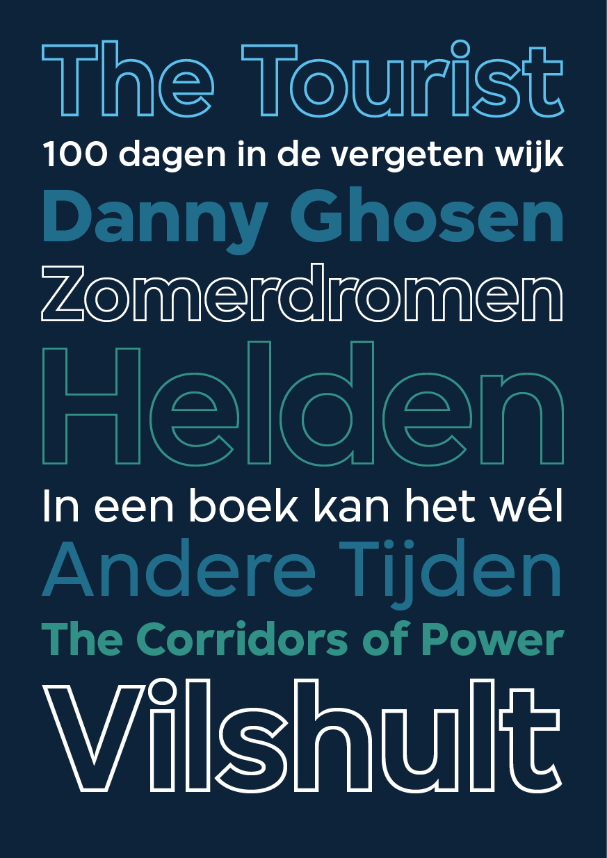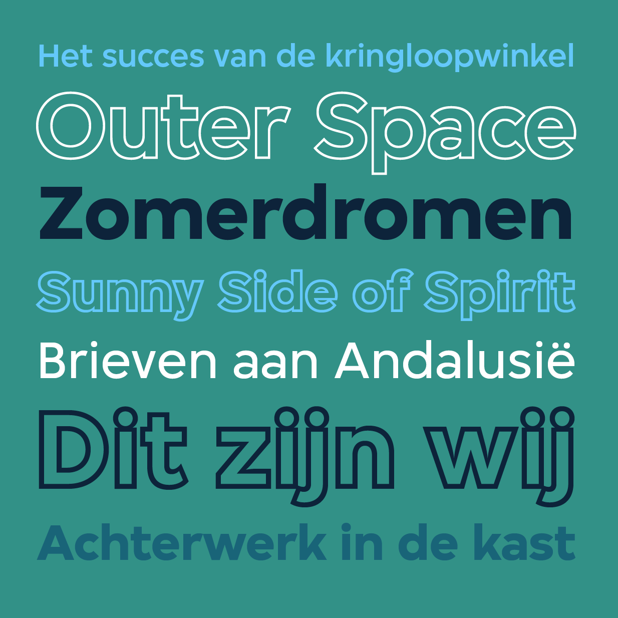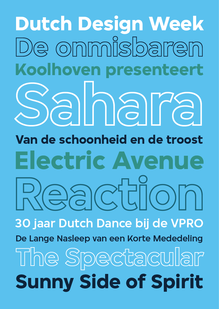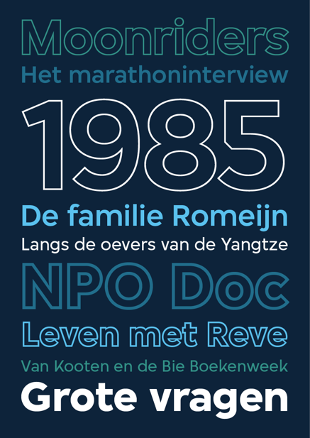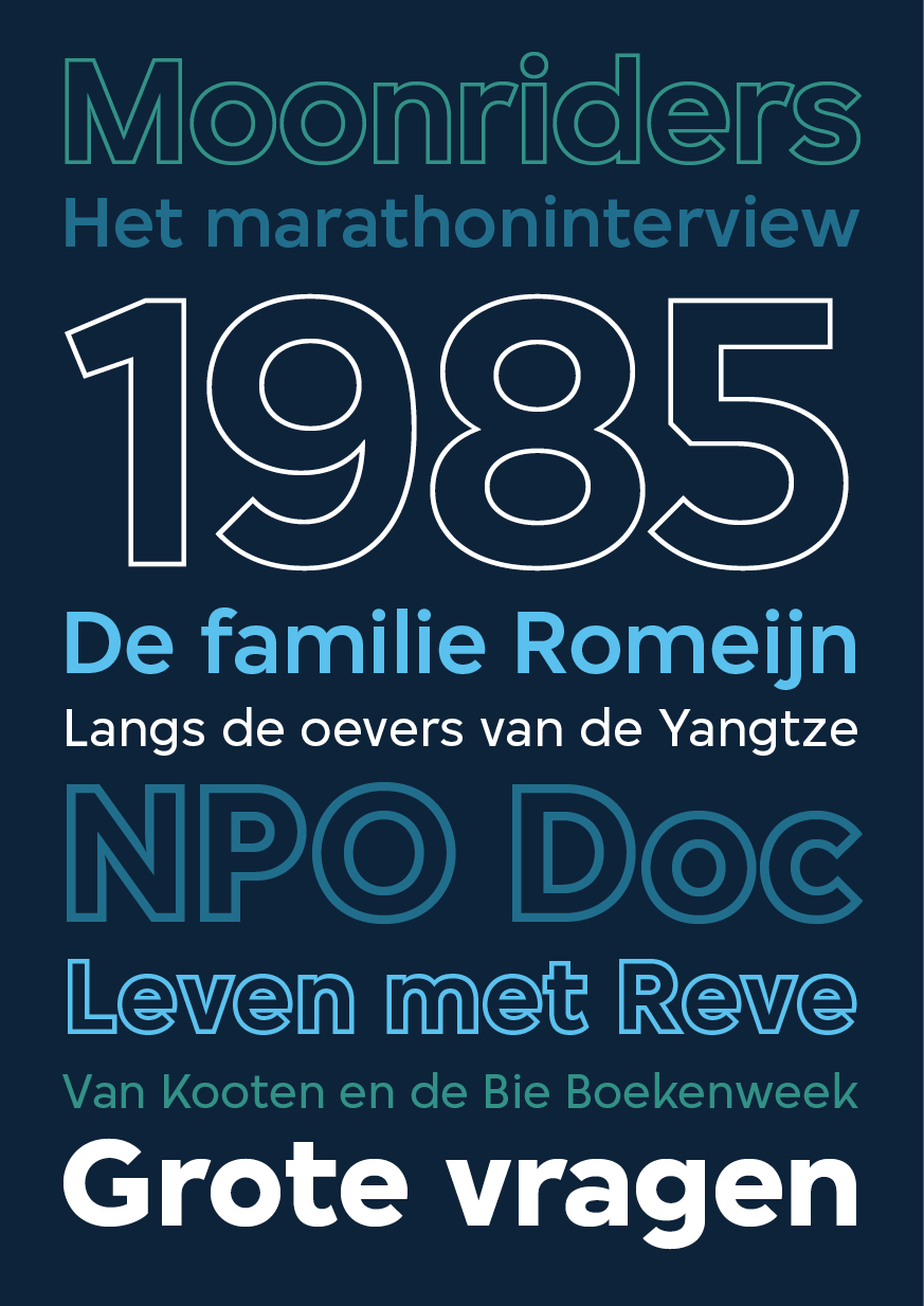 The typeface belongs to the genre of geometric sans-serifs, a group in which Futura (1927) and Avant Garde (1970) can be regarded as the most prominent members. Compared to those two typefaces, the VPRO family is less rigid — the ‘o’ is not a perfect circle for instance — and has a warmer, more humane appearance. The three weights include many stylistic alternates and special ligatures such as the Dutch ‘ij’ and ‘IJ’-digraph.