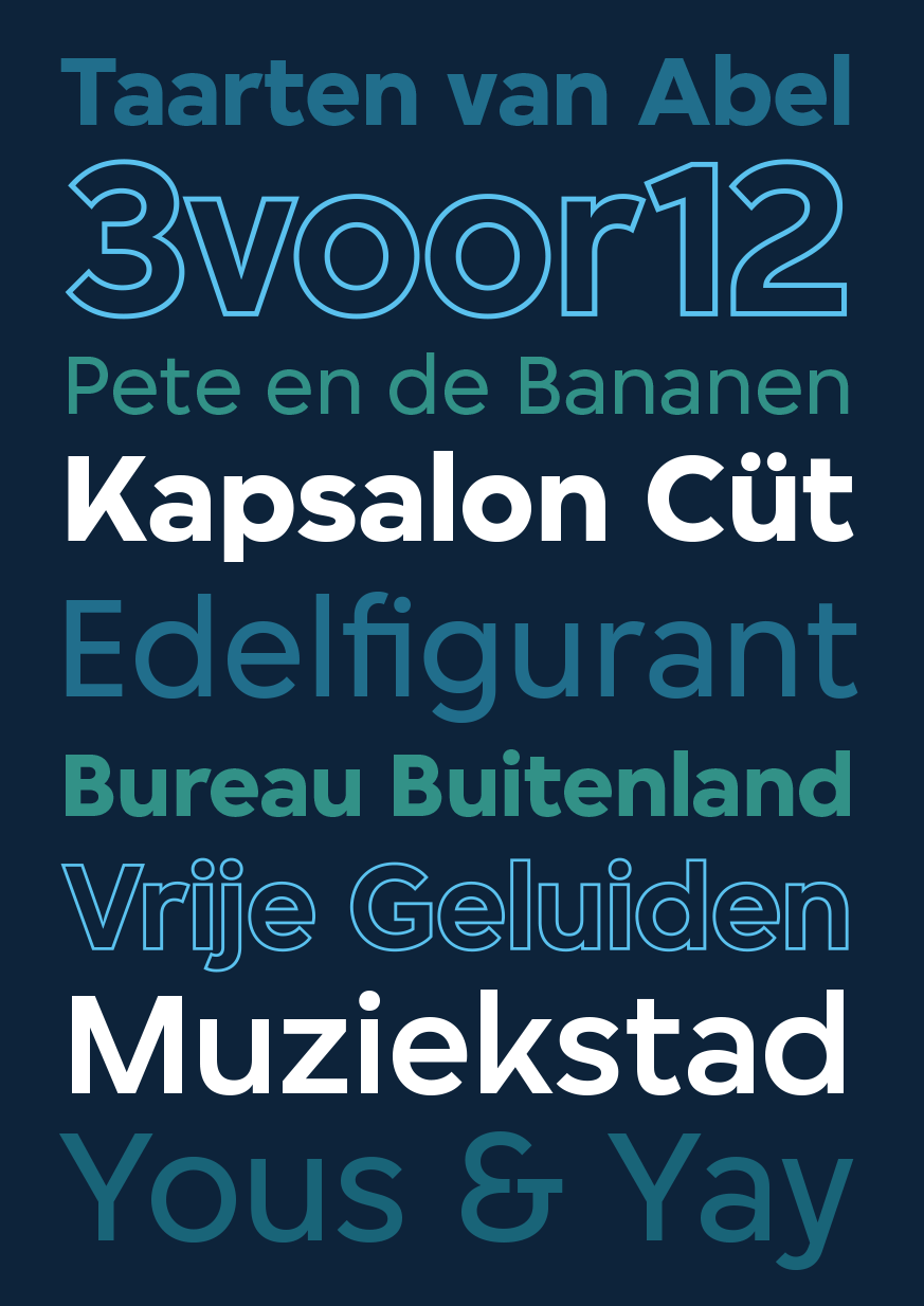 The typeface belongs to the genre of geometric sans-serifs, a group in which Futura (1927) and Avant Garde (1970) can be regarded as the most prominent members. Compared to those two typefaces, the VPRO family is less rigid — the ‘o’ is not a perfect circle for instance — and has a warmer, more humane appearance. The three weights include many stylistic alternates and special ligatures such as the Dutch ‘ij’ and ‘IJ’-digraph.