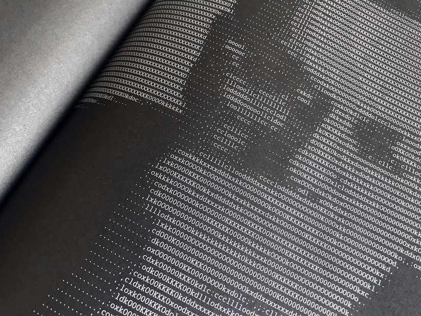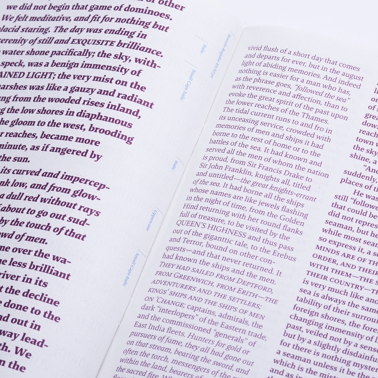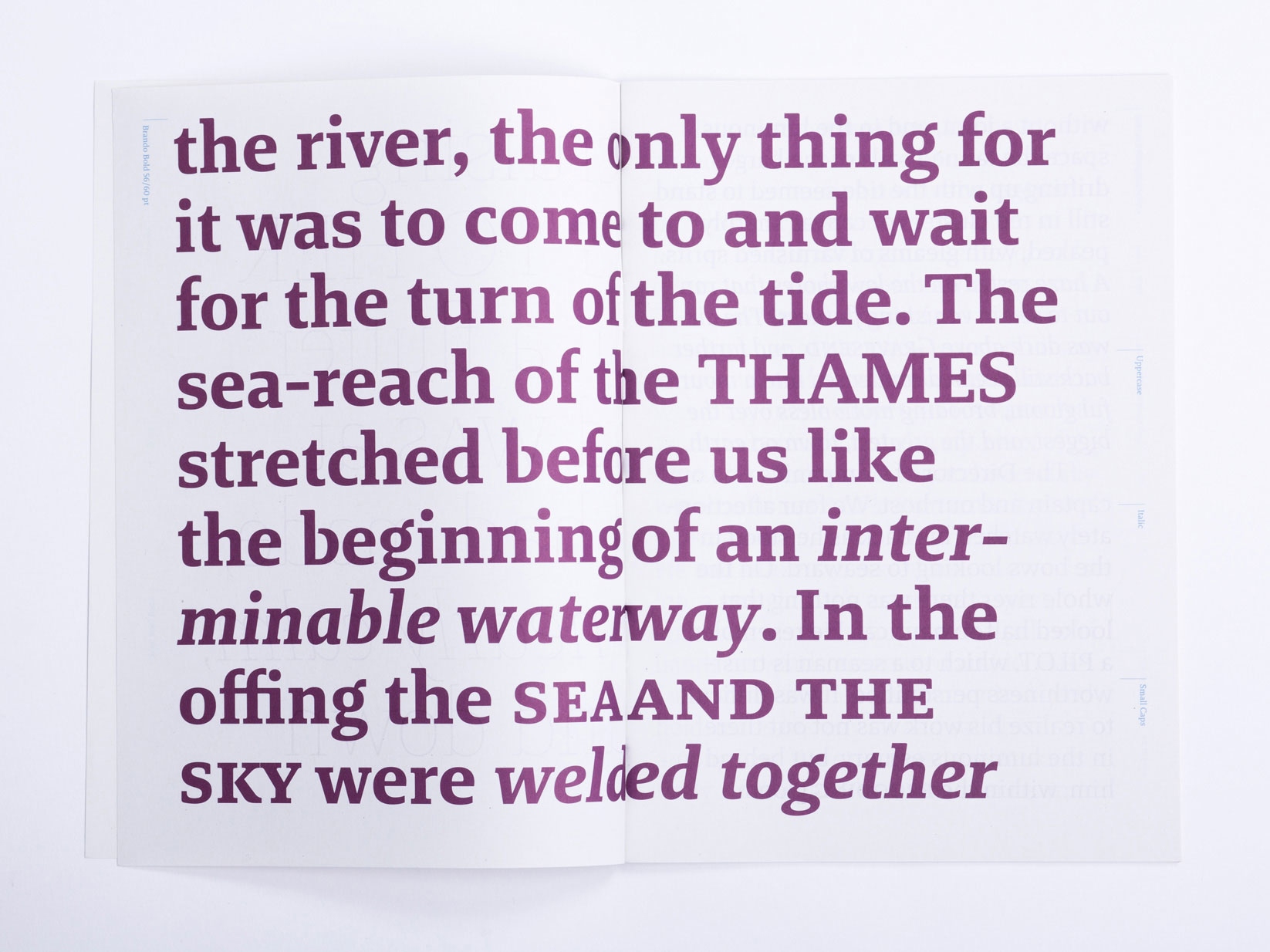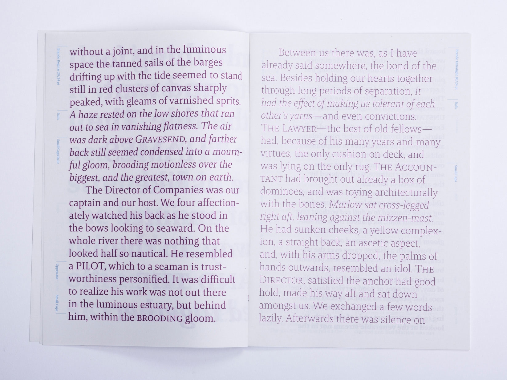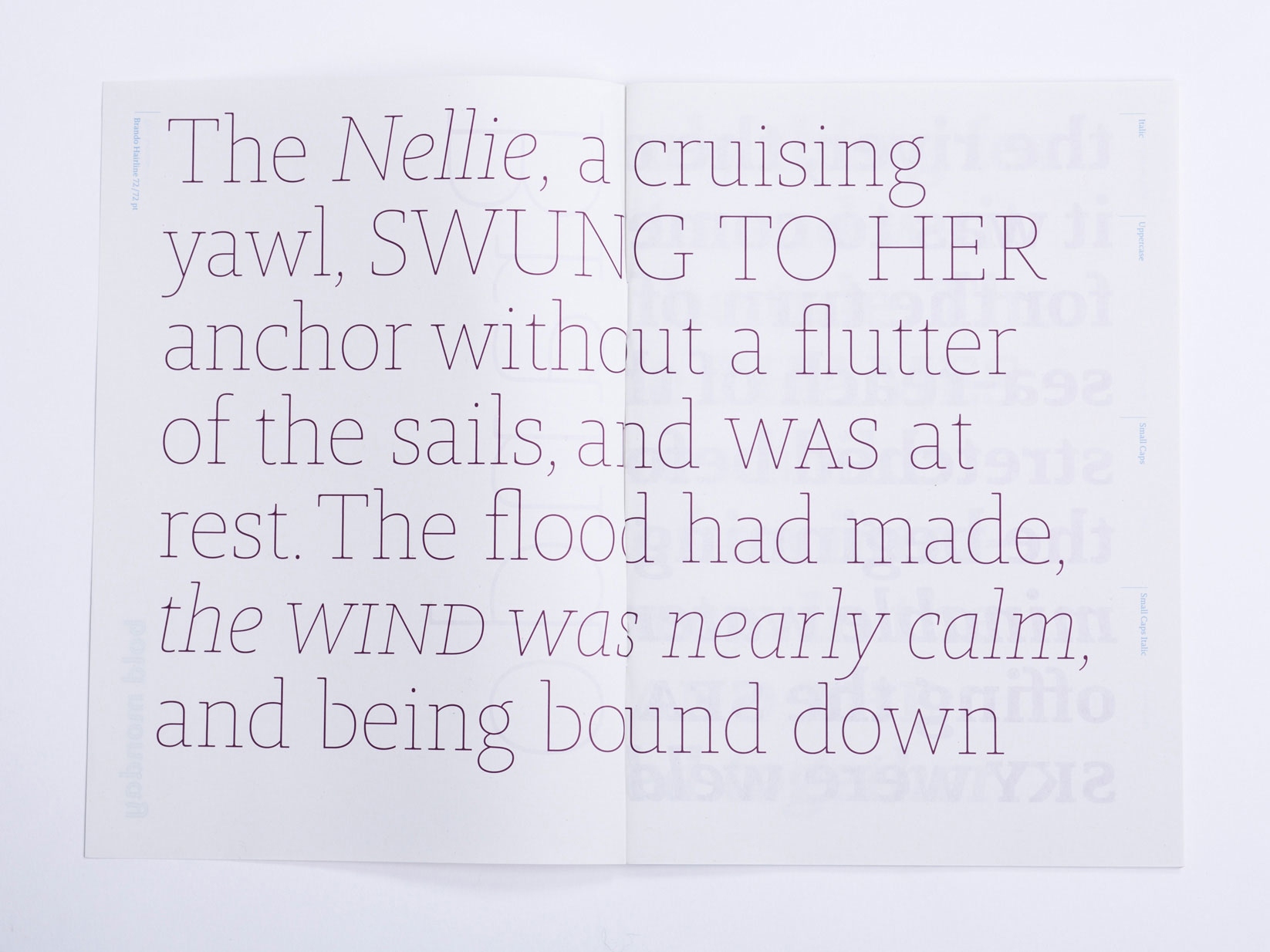 Specimen booklet for Brando by Mike Abbink showcasing the extensive family in airy sample designs of an excerpt of the “The Heart of Darkness”, a novella by Joseph Conrad from 1899 (including a Marlon Brando portrait, the eponym of the type family).