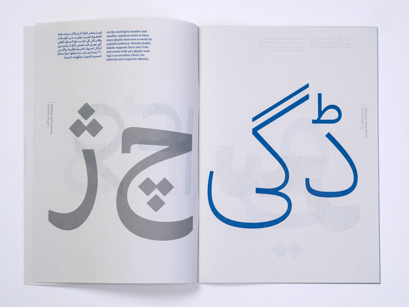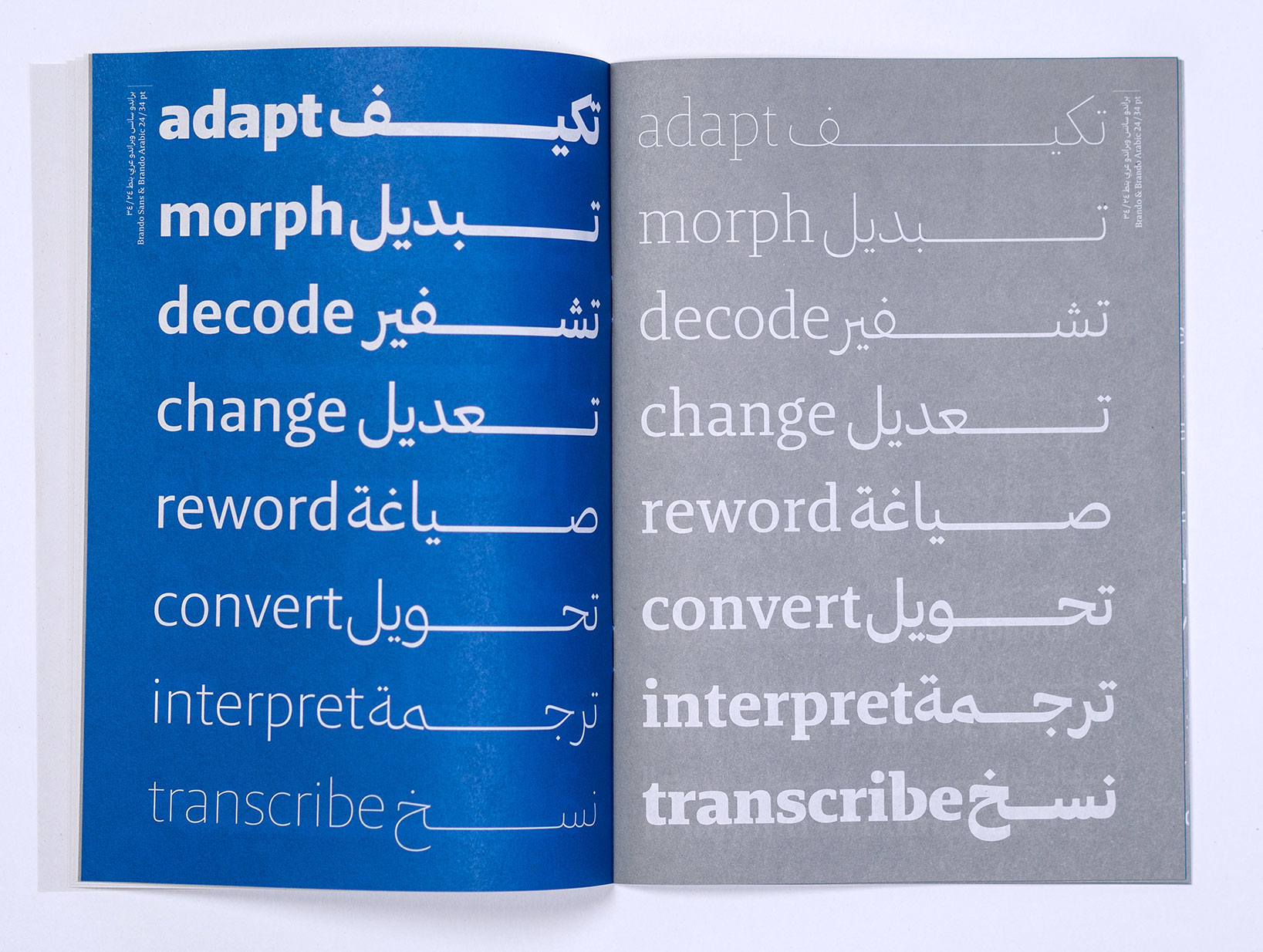 Specimen booklet presenting the Arabic version of Brando following the conventions of the Naskh script. Typeface designed by Khajag Apelian, Wael Morcos and Mike Abbink.