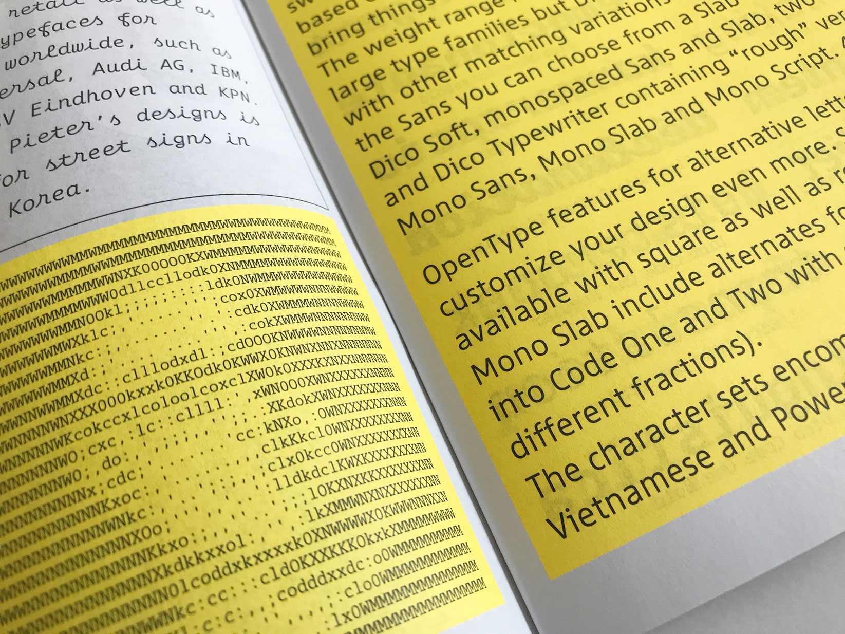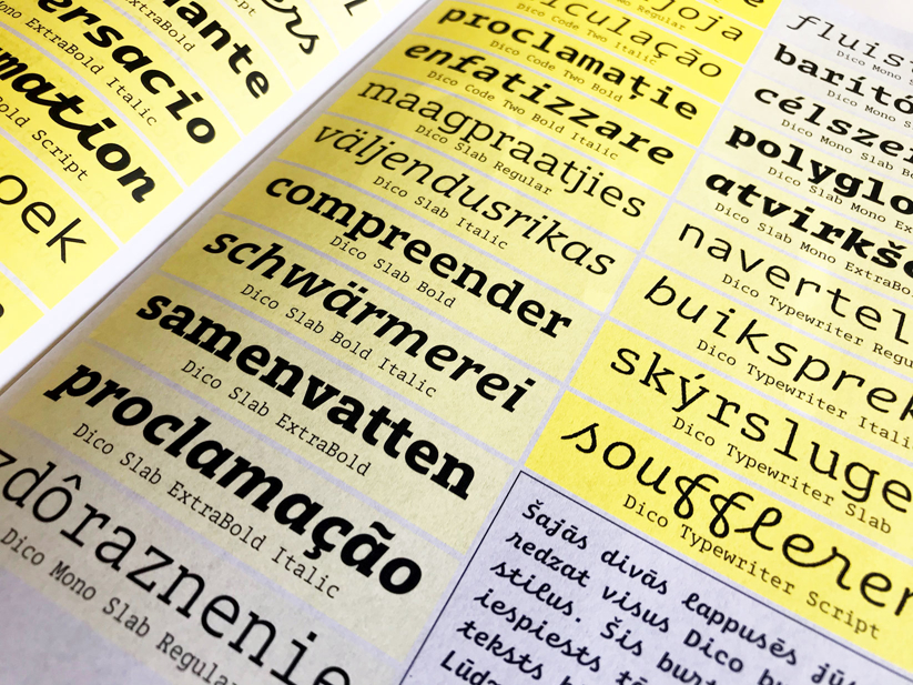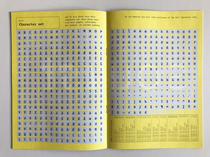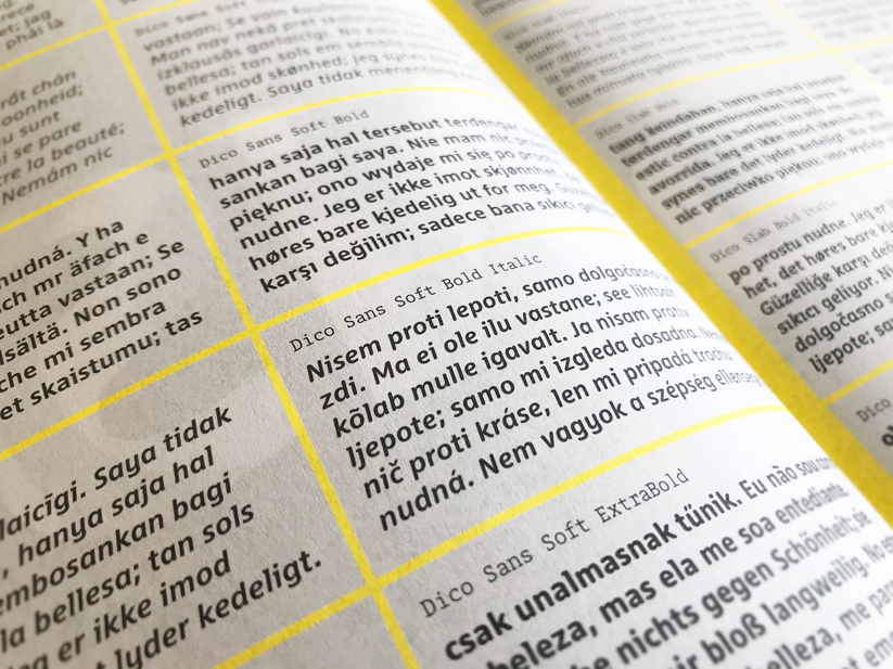 Specimen booklet for Pieter van Rosmalen’s Dico type suite, showing all eight sub families, 45 styles in total. The specimen is using Tibor Kalman’s quote “I’m not against beauty, it just sounds boring to me” throughout the entire booklet.