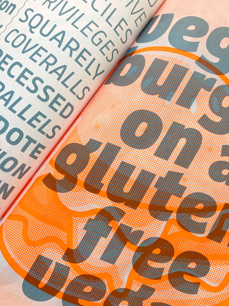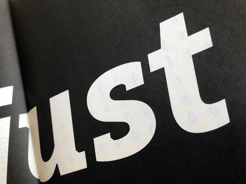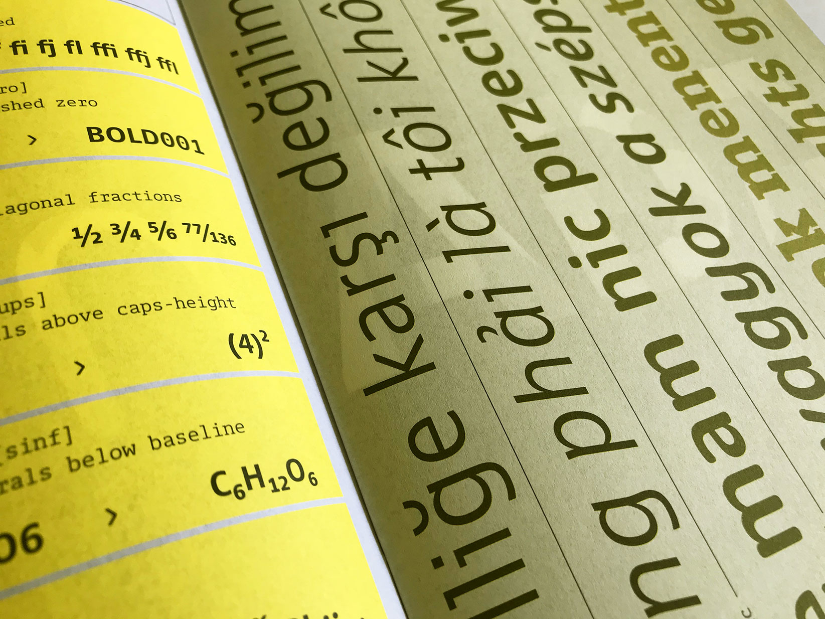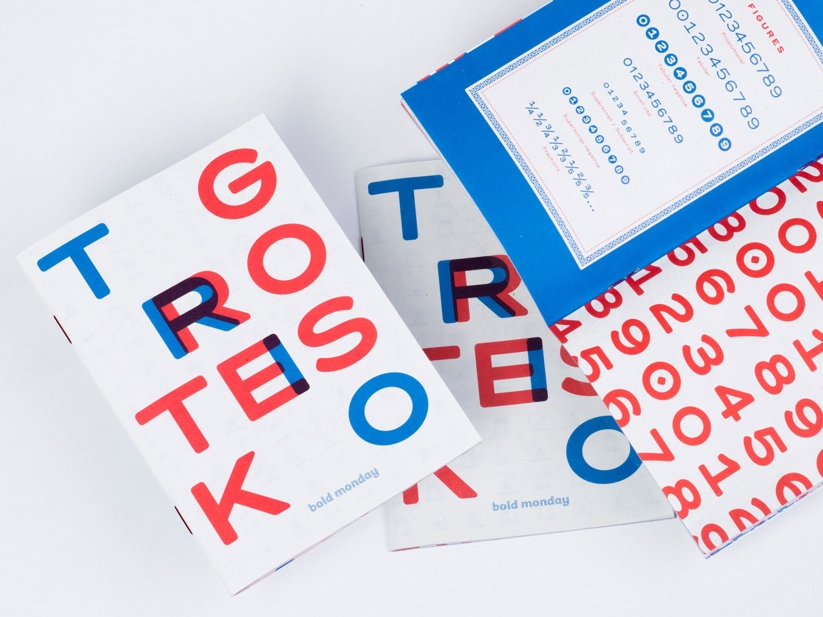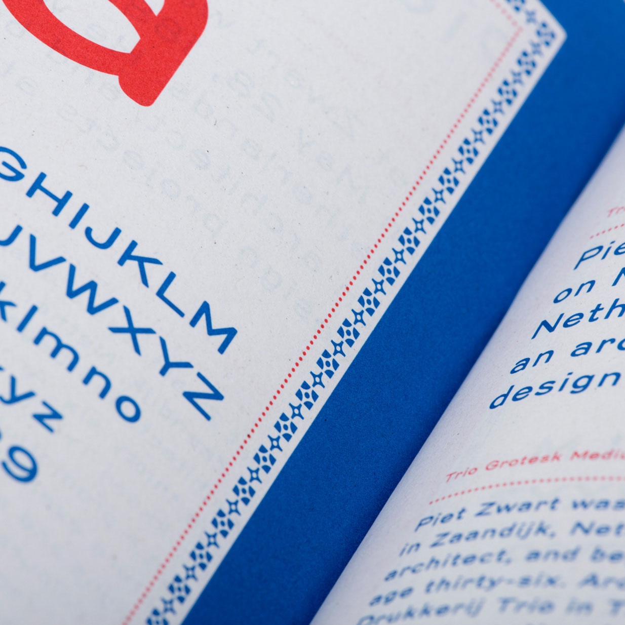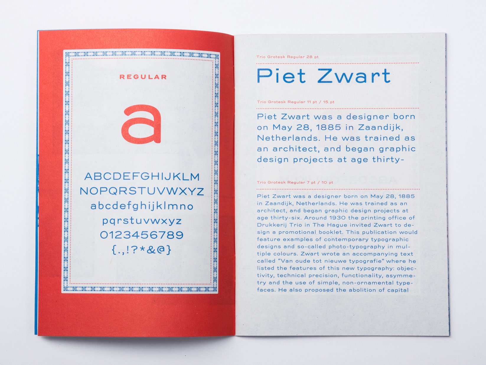 Lovely little specimen booklet for Florian Schick’s Trio Grotesk type family, showing the typeface in all upright styles, different sizes and with complete character-set in a low-lands-inspired two-colour design.