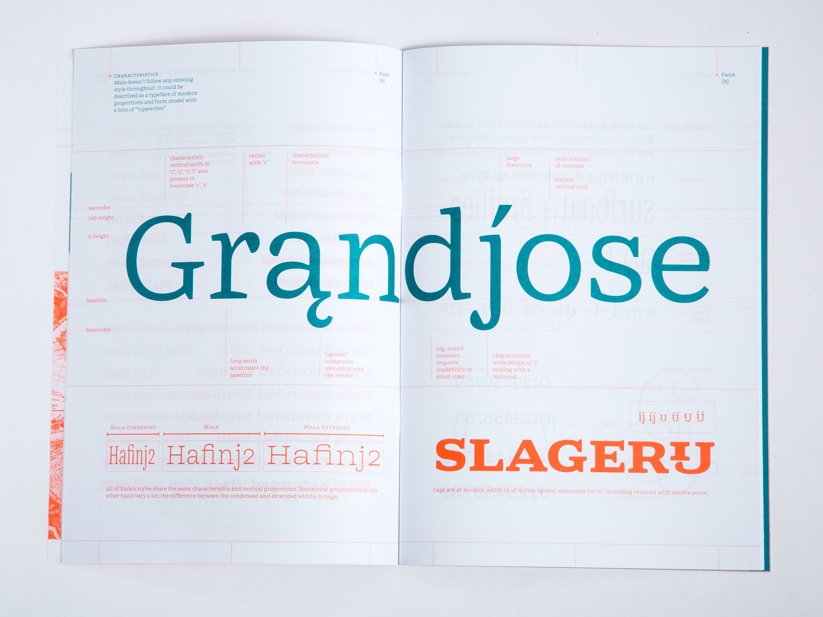 Specimen booklet for the extensive Mala type family, designed by Barbara Bigosińska.