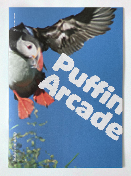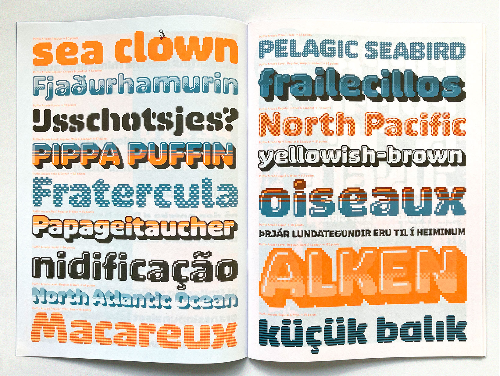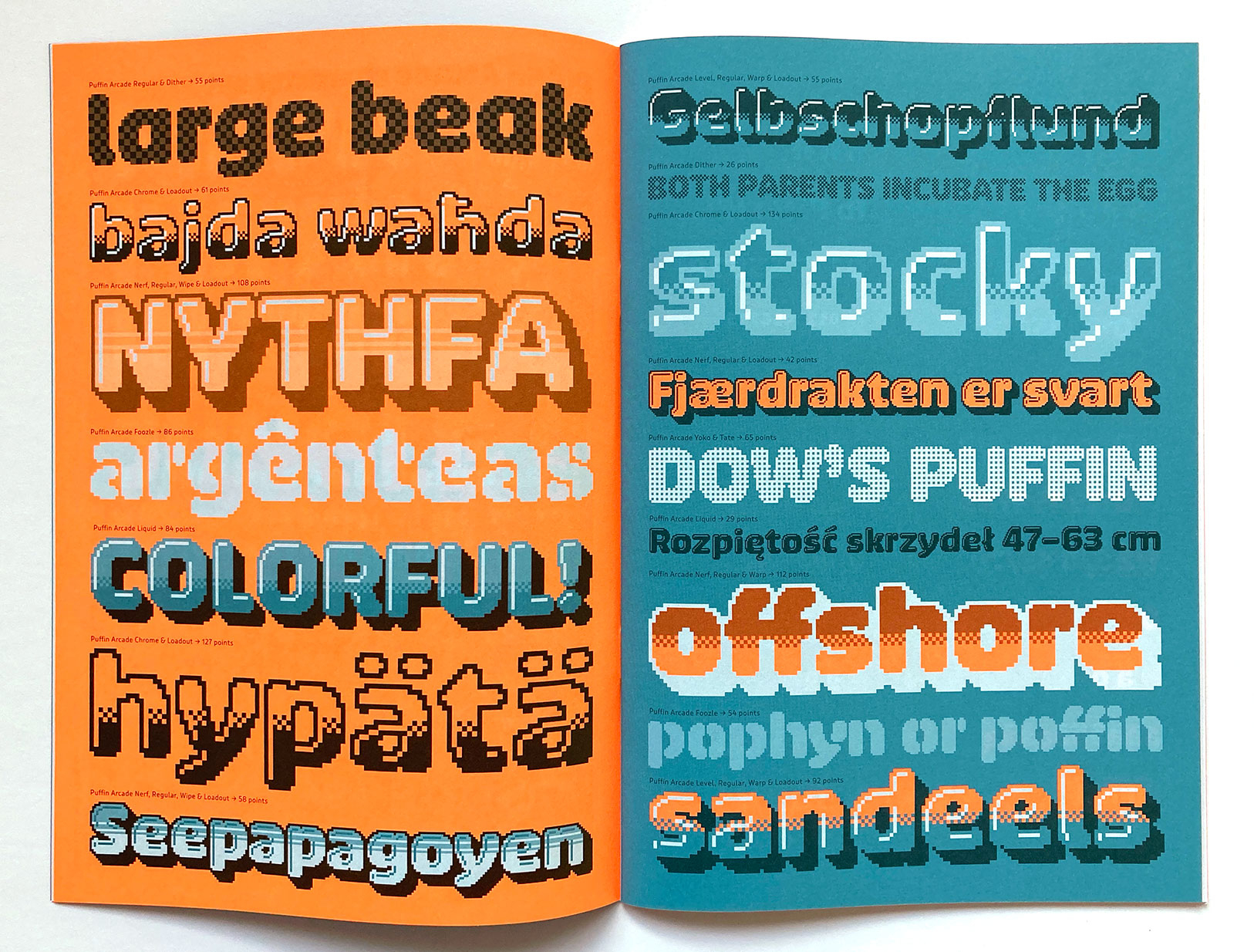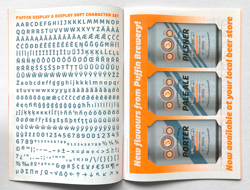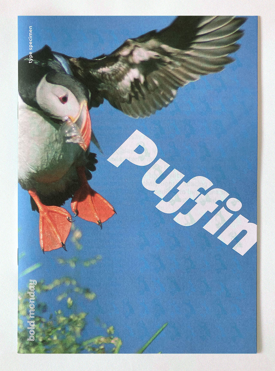 “Double fronted” specimen booklet showing the Puffin, Puffin Display, Puffin Display Soft and Puffin Arcade type families, designed by Pieter van Rosmalen.