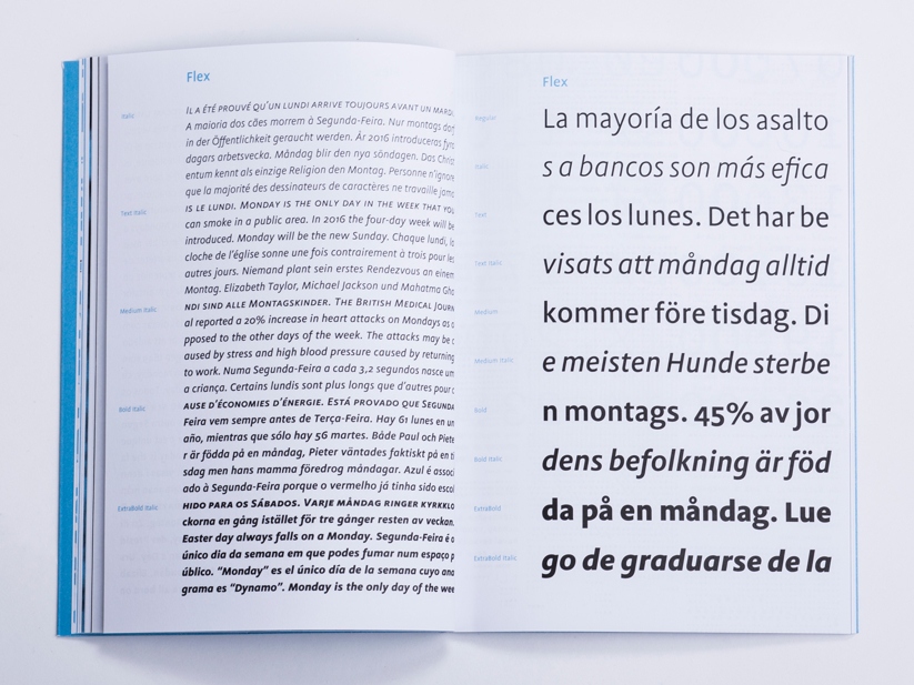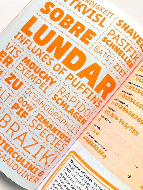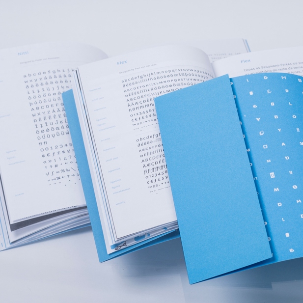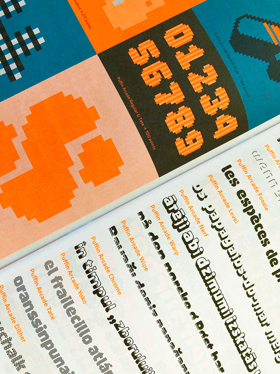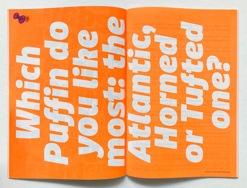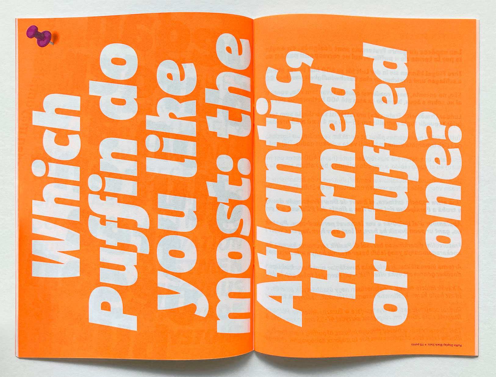 “Double fronted” specimen booklet showing the Puffin, Puffin Display, Puffin Display Soft and Puffin Arcade type families, designed by Pieter van Rosmalen.