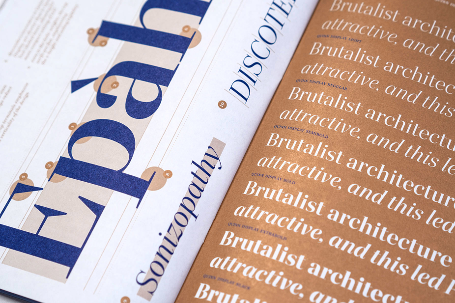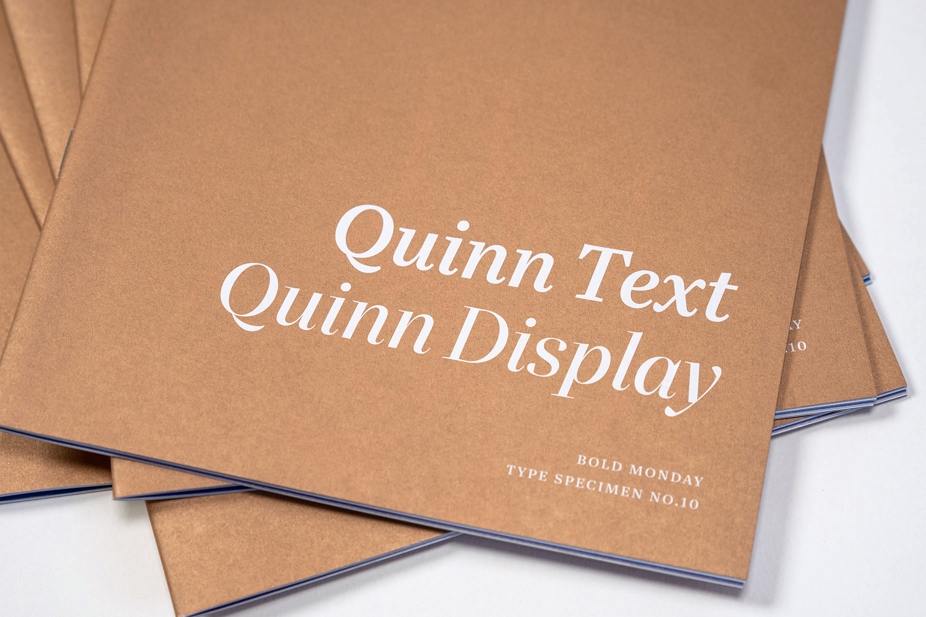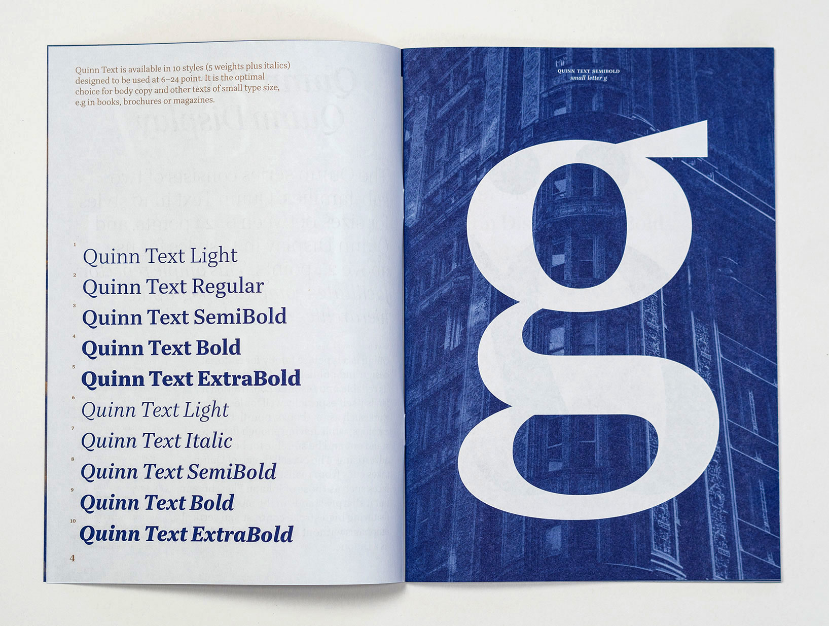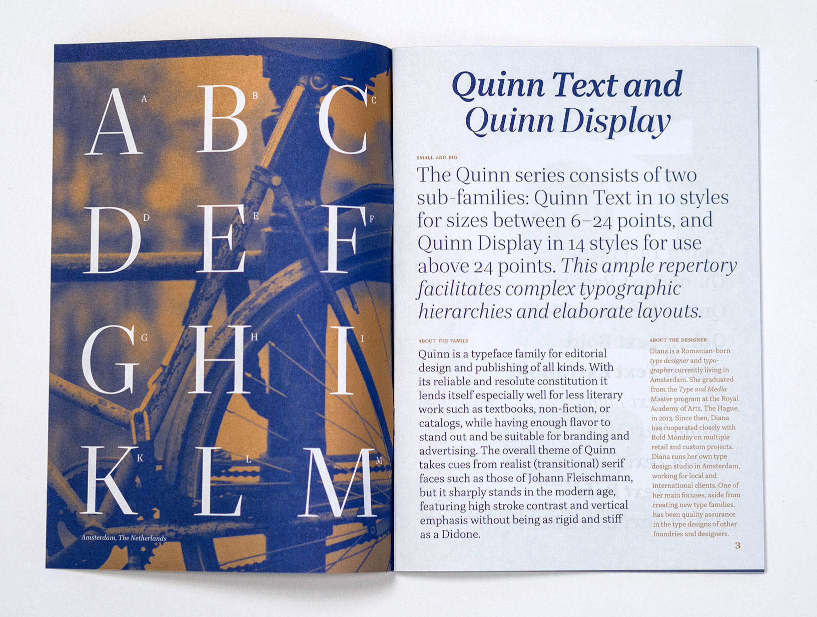 Specimen booklet showing the Quinn Text and Quinn Display type family, designed by Diana Ovezea.
