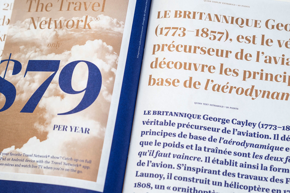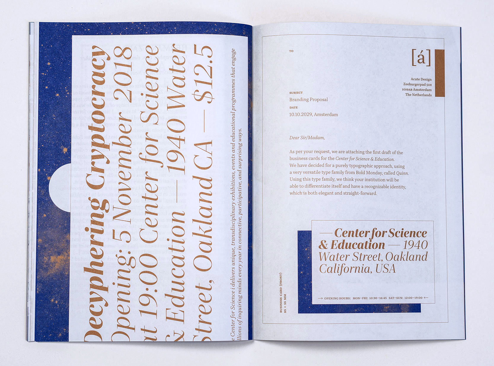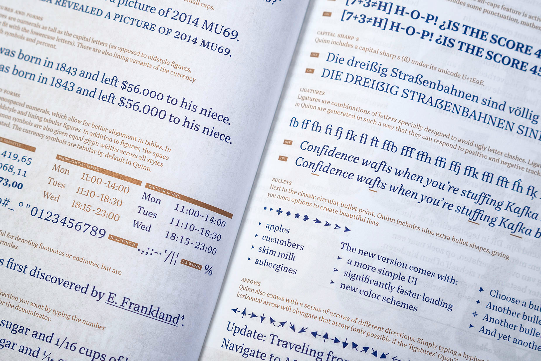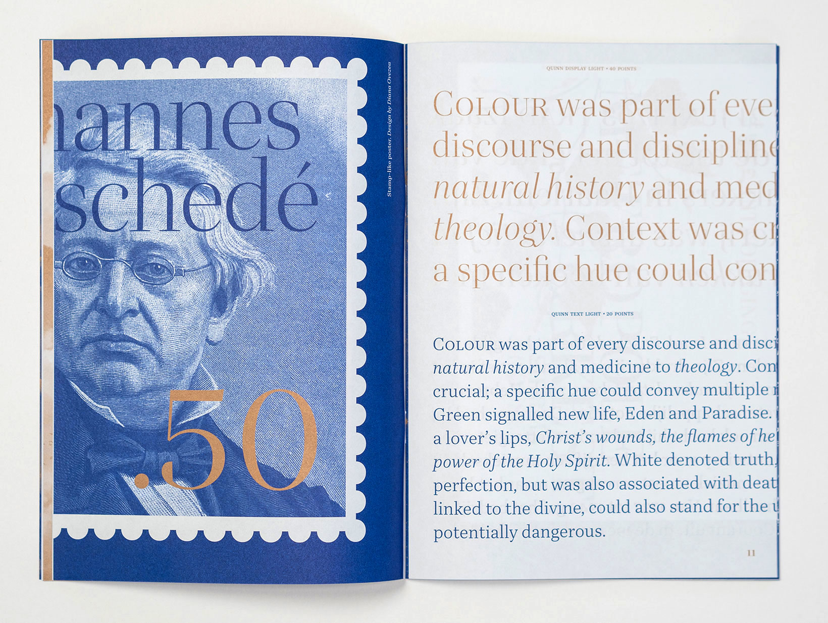 Specimen booklet showing the Quinn Text and Quinn Display type family, designed by Diana Ovezea.