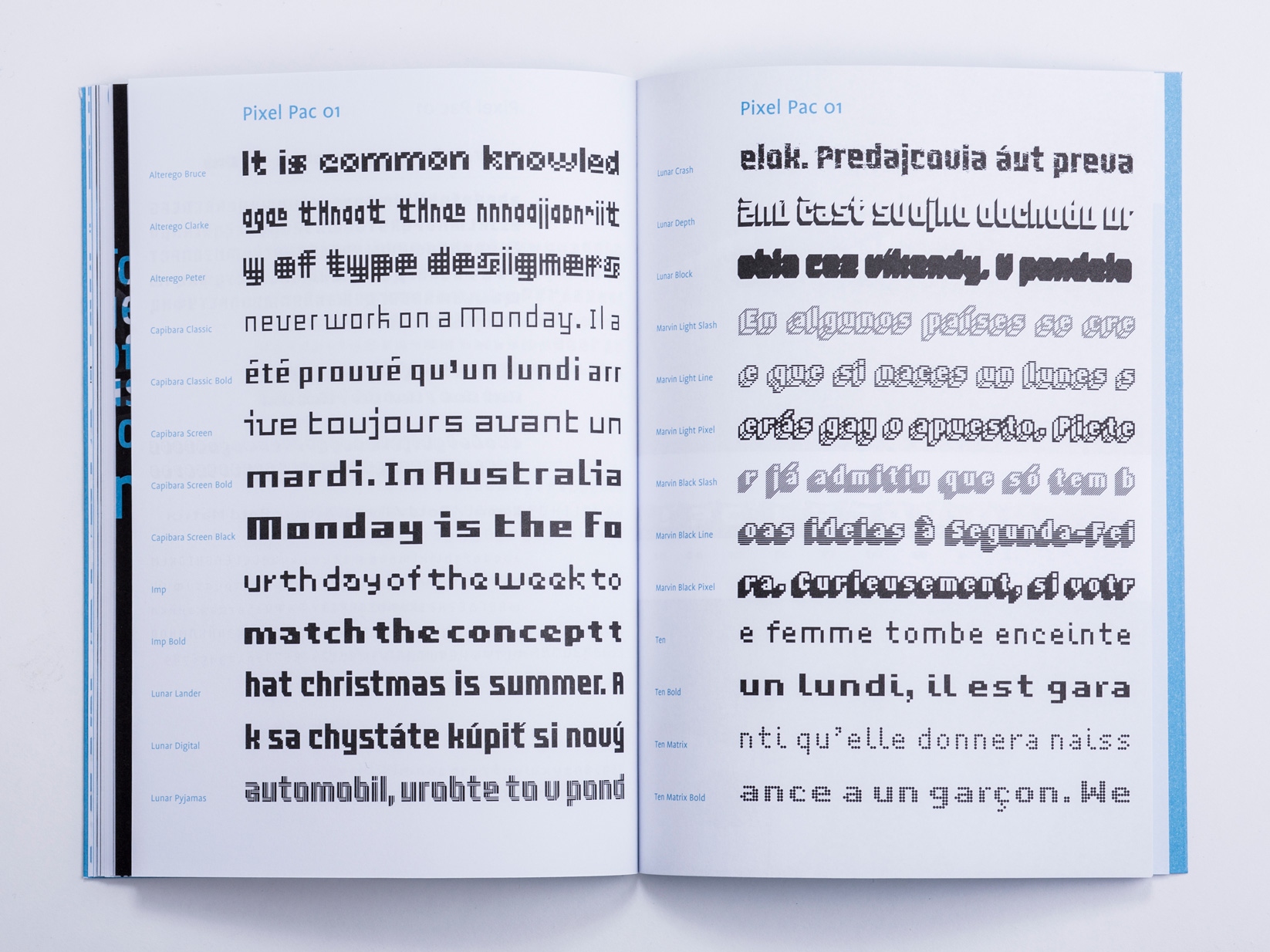 Specimen No 1 was our first comprehensive type specimen. To celebrate this occassion, we asked 14 friends to design specimen spreads for one of our type families to act as devider pages between the general type showings, style and character overviews. Also includes samples of custom typefaces and a preview of (then) upcoming work. Many thanks to our contributors Koen Geurts, René Knip, Max Kisman, Donald Beekman, Tobias Peier, Indra Kupferschmid, R2, Liza Enebeis & Marc van der Heijde, Léon & Loes, Dennis Koot, Bart de Haas, Jesse Skolnik, and Stefanie Bitzigeio.