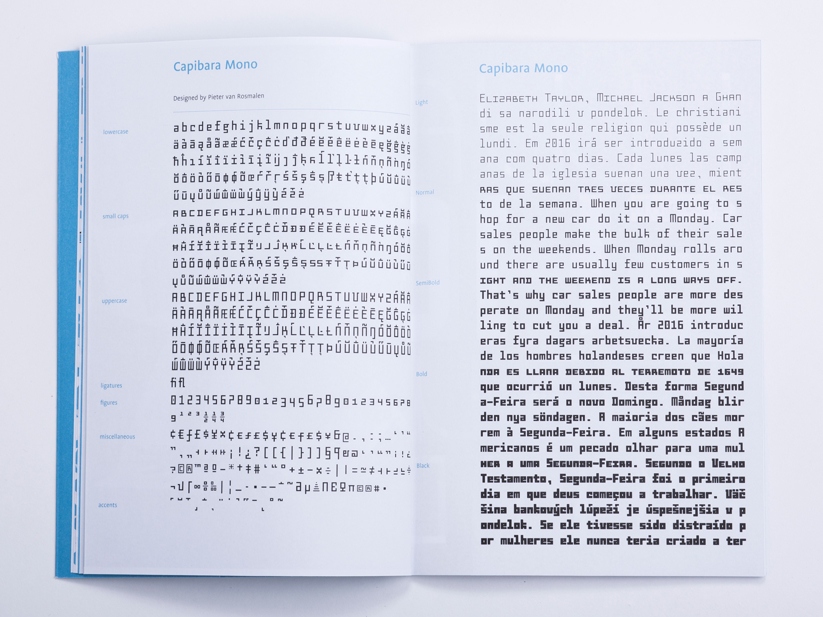 “Enorm klein” (enormously small) is a collection of the biggest amongst the smallest and the smallest amongst the biggest. The booklet is entirely typeset in Capibara Classic, the precursor of the current Capibara family, as well as richly illustrated and decorated. Comes with a matching bookmark.