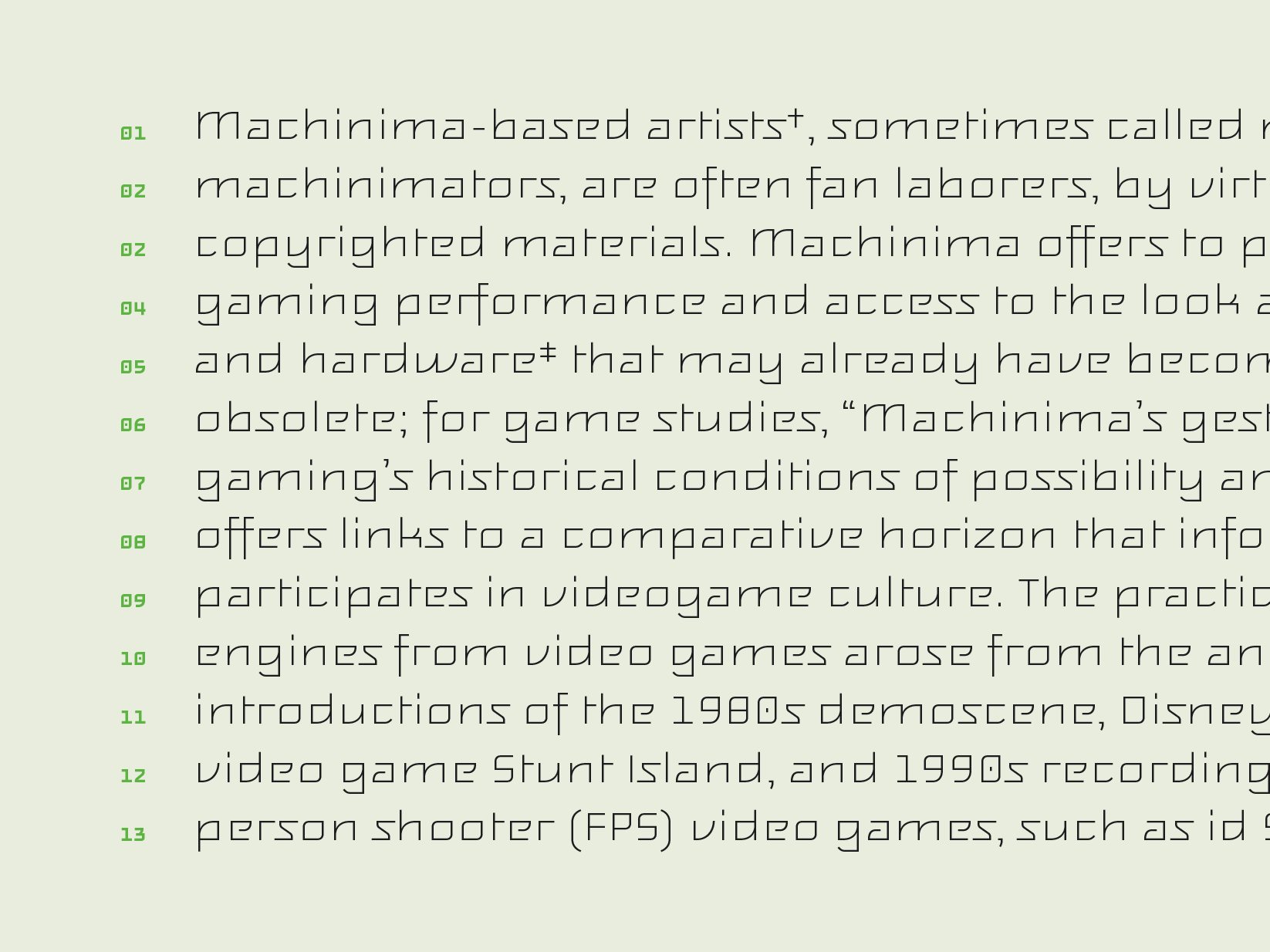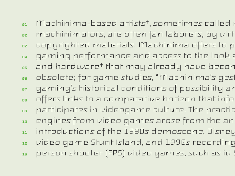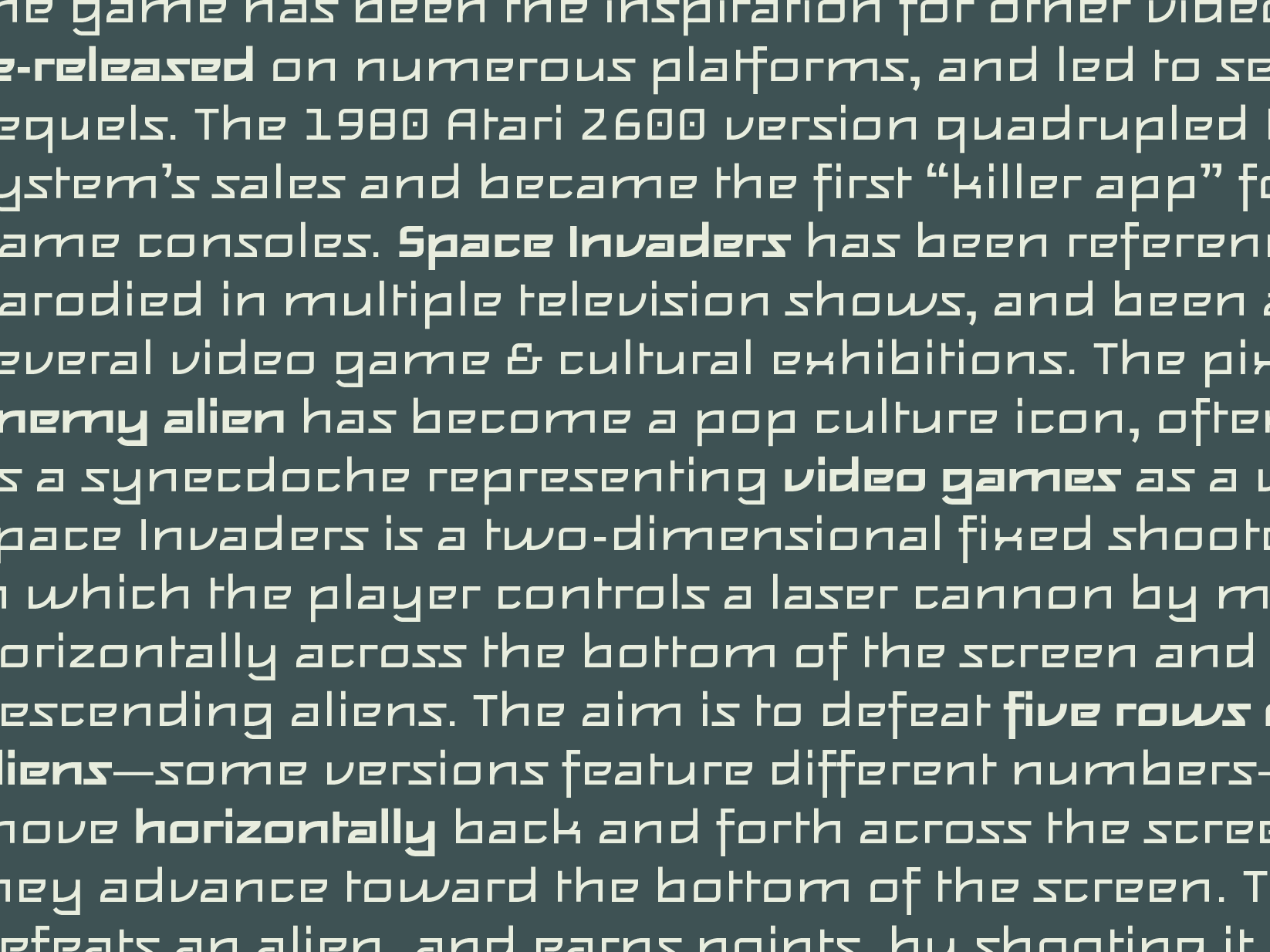 The family originally started as a 12 pixel bitmap font for a user-interface, which this outline version is based on. Drawing the current family, many details have been reinterpreted to amend the limitations of the pixel grid. Feisar is expressive and recognizable but still surprisingly readable since the underlying bitmap design was tailored for a small size.