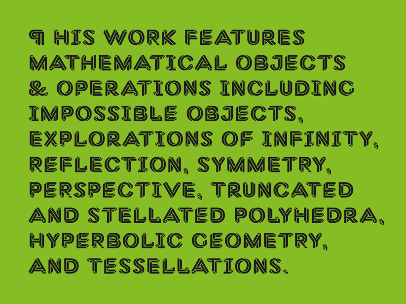 Macula can be described as the ‘impossible typeface’ for its design is based on the concept of impossible objects. This optical illusion was extensively explored in the 1930’s by Swedish artist Oscar Reutersvärd, and simultaneously made very famous by Dutch artist M.C. Escher.