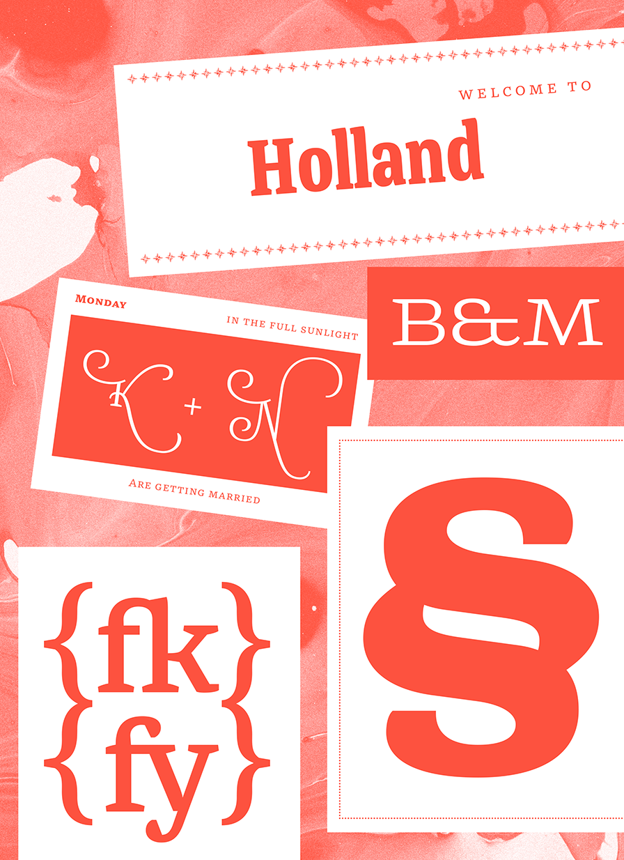 Mala’s basic styles of normal width are geared to setting texts in a wide range of sizes and length — from headlines to body copy to labels or glosses. The Condensed and Extended styles on the other hand are designed for extreme situations where one has to work with either plenty or very little space, for instance compact titles as well as sweeping, exuberant display typography. All styles include two sets of decorative swash capitals for extra lavish layouts and many OpenType features such as small caps, an extended set of ligatures, ornaments, arrows, different sets of numerals, fractions and ordinals — all across an extended Latin character-set.