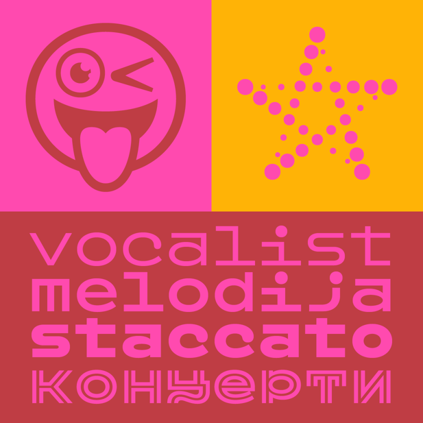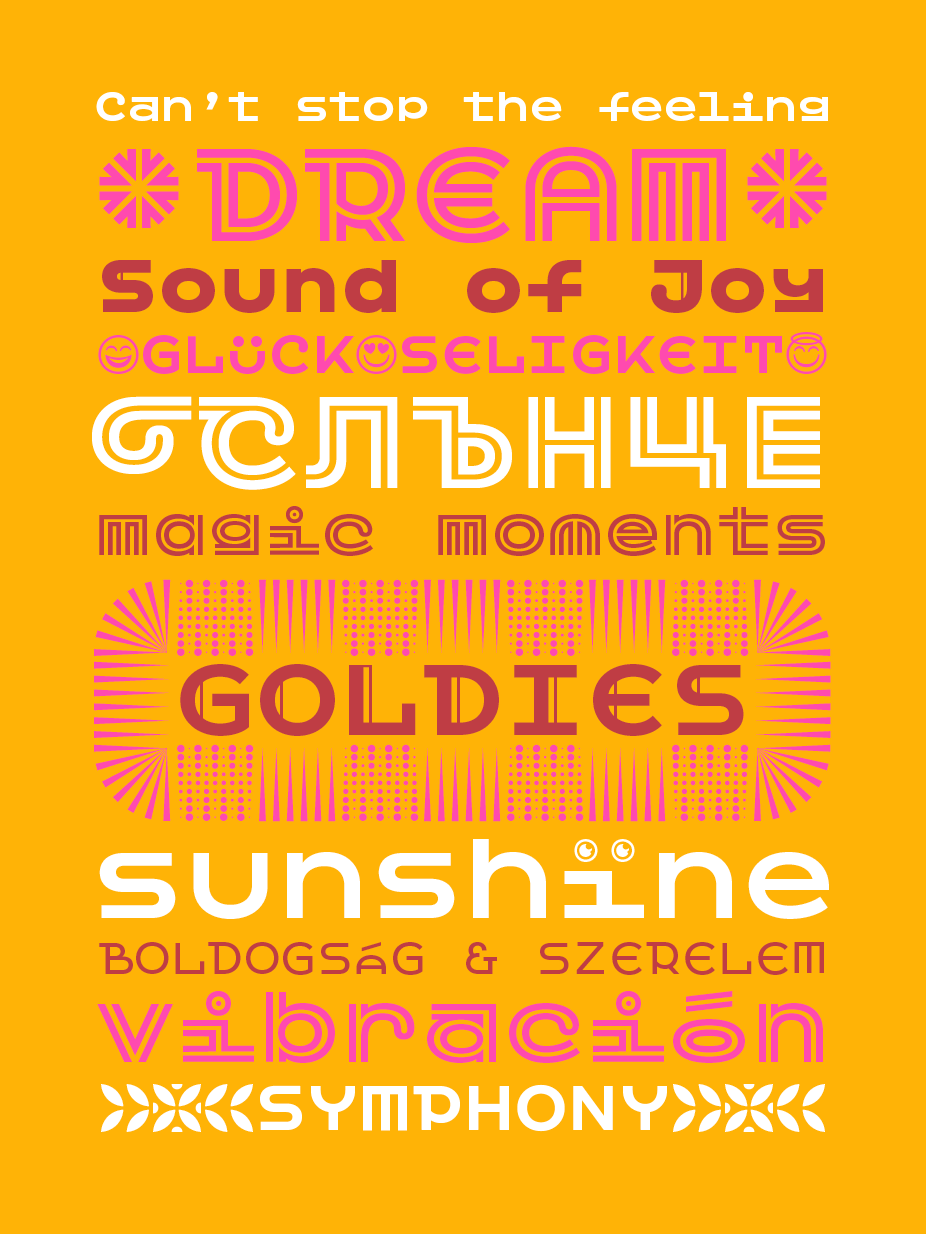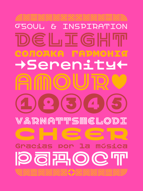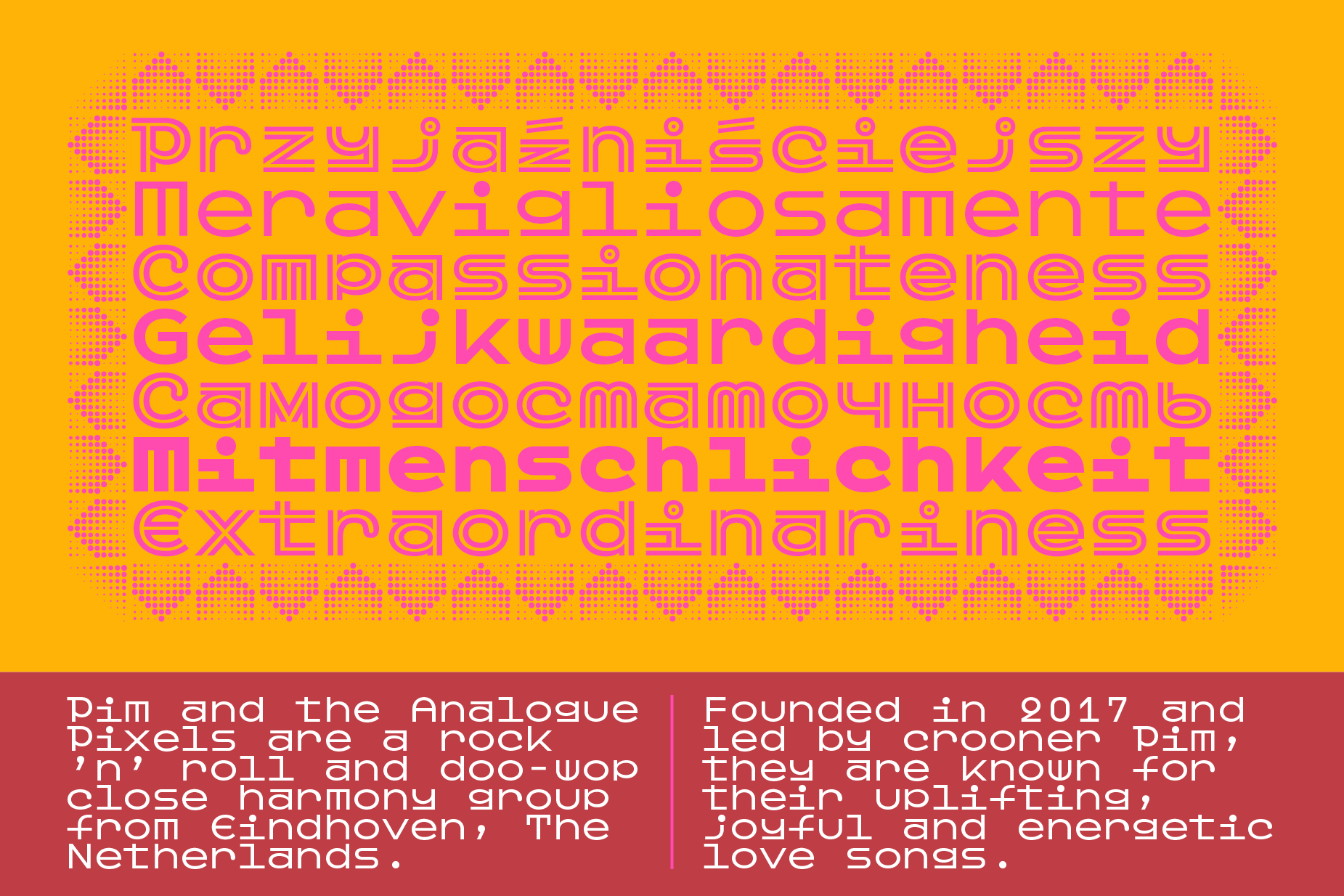 These letterforms were inspired by the iconic ‘Pootjesglas’ etalage lettering in Dutch shop windows of the mid 20th century, named after Johannes Willem ‘Pim’ Pootjes. The wide, round shapes, distinct ball terminals and bold, round punctuation of these glas advertising boards had fascinated van Rosmalen for a long time. While analogue Pim only consisted of capital letters, digital Pim adds an extensive repertoire of lowercase, alternates, pictograms, ornaments, borders, patterns and display numerals that hark back to their origin. It covers the extended Latin and Cyrillic character-set (with Bulgarian and Serbian alternates) across three weights and an inline style.