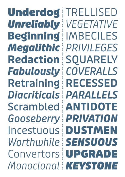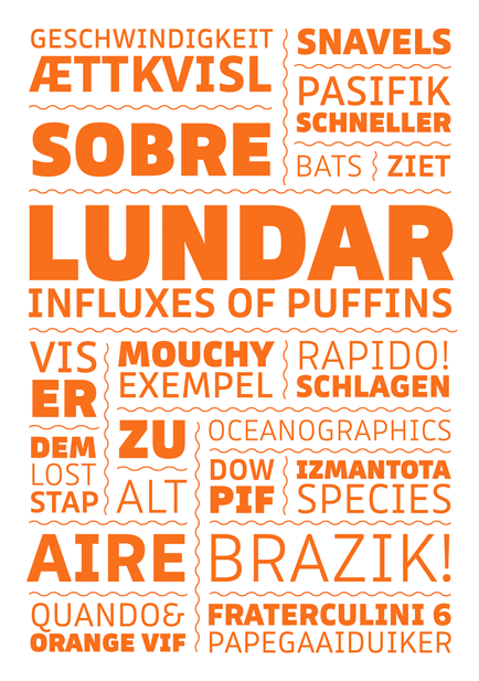 The extended “normal” family consists of Puffin, Puffin Display and Puffin Display Soft, each available in seven weights plus italics. The plain version of Puffin is the most tamed member. A versatile humanist sans with generous spacing and pronouncedly oblique italics (15°) that is well-suited for on-screen reading and user interface design. Capital I, lowercase l and the numeral 1 have unique forms so they are not easily confused.