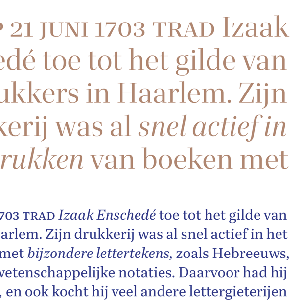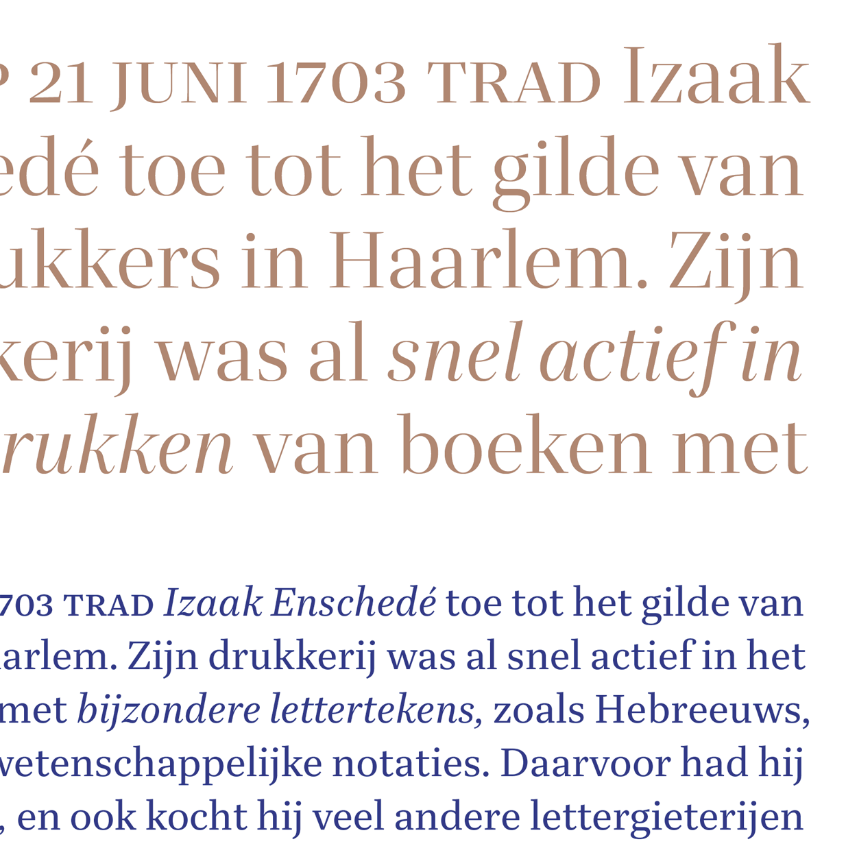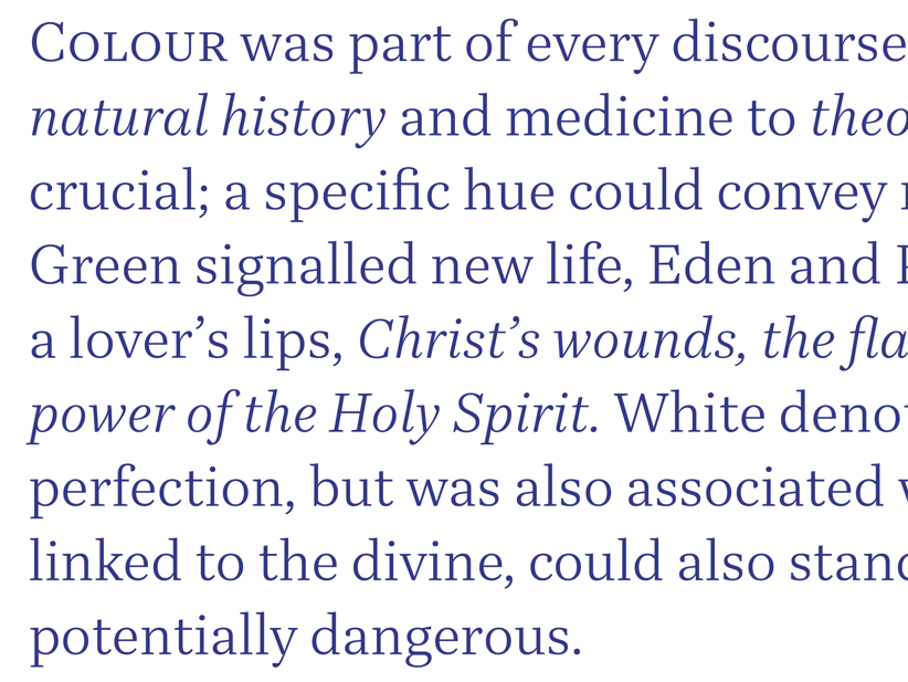 The Quinn series consists of two sub-families: Quinn Text in 10 styles for sizes between 6–24 points, and Quinn Display in 14 styles for use above 24 points. This ample repertory facilitates complex typographic hierarchies and elaborate, varied layouts.