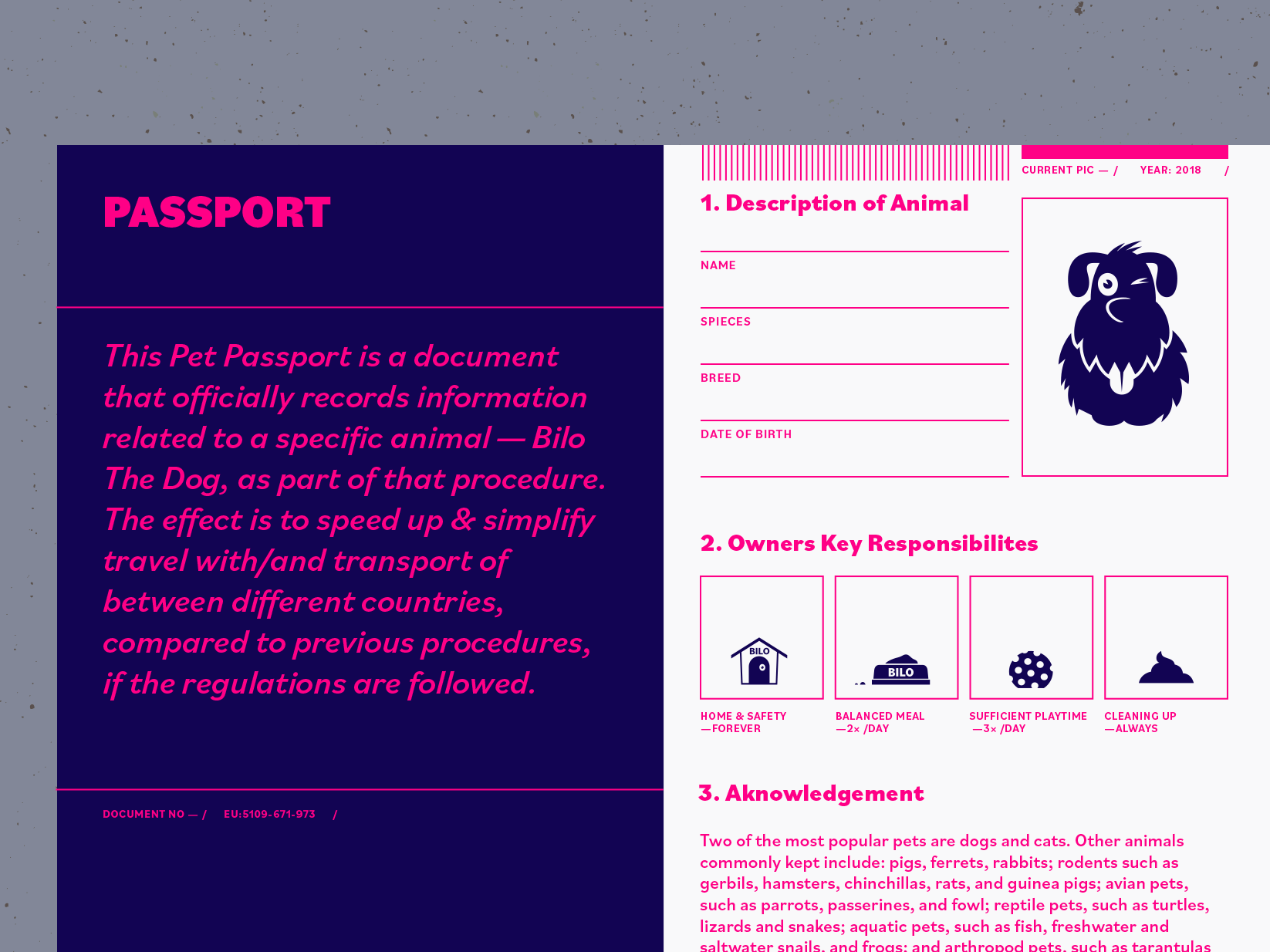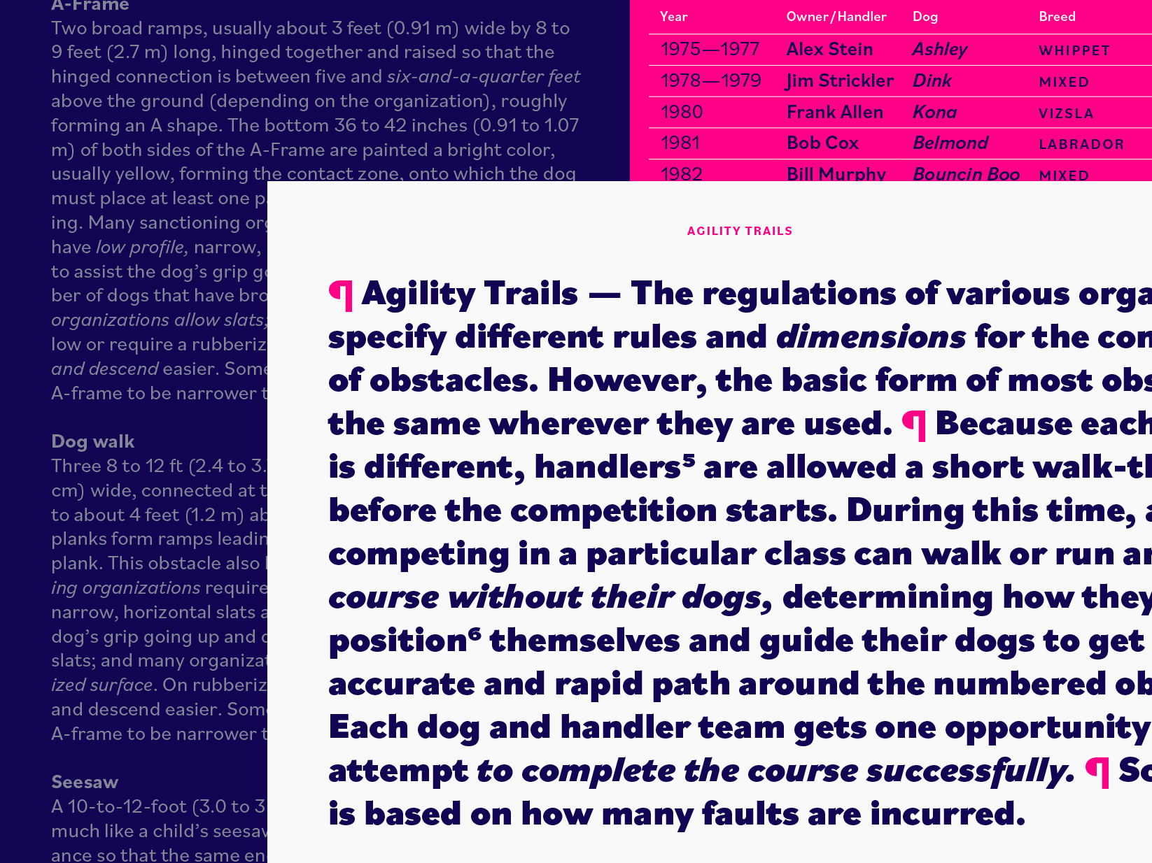 Some of Bilo’s signature characters, like ‘G’, ‘R’ or ‘a’, make it easy to recognize and unique. You can customize the design and dress things up or down by using one or several of the included alternate glyphs via OpenType features. For instance, there is an ‘a’ with a more conventional bowl, and a round, single-storey one which changes the flavour of the grotesque quite significantly in the direction of a geometric sans. Lowercase ‘f’ is also available with a shortened top curve and in a third form with a one-sided crossbar (analogously ‘t’ and ‘ß’). For ‘y’ you can choose a more English form with a hooked descender. Arrows, several sets of numerals and fractions round out the comprehensive character set, but the secret star of the family is Bilo the dog. The typeface is named after the pet of van Rosmalen’s sister – Bilo (pronounced bee-low) – and each style includes 18 different dog-related icons designed by Dirk Uhlenbrock. Go find ’em!