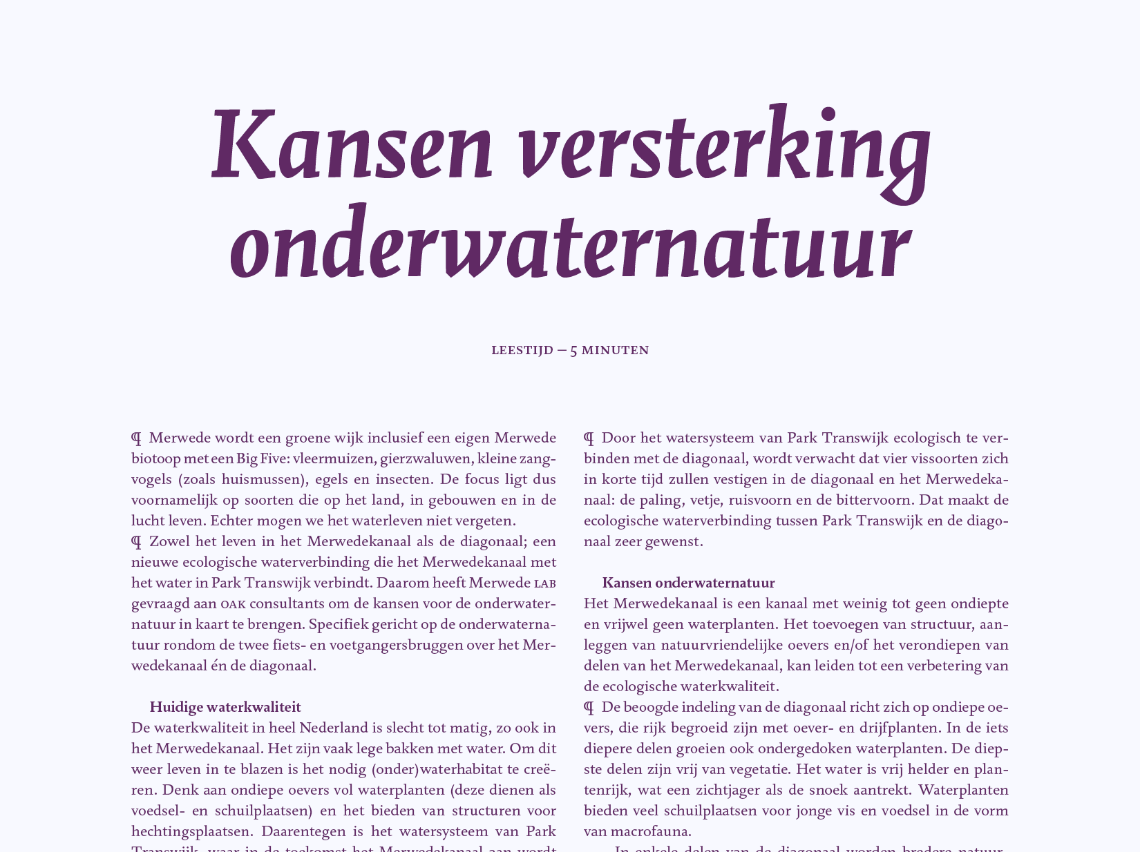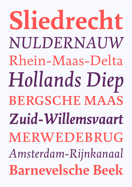 In addition to the three standard weights Regular, Medium and Bold, Merwede – named after a river in the west of The Netherlands – includes an intermediary weight called ‘Firm’. Merwede Firm is slightly heavier than Merwede Regular and was designed for posters, inscriptions or reversed-out text. All weights set to the same width so changes in the font weight won’t cause any reflow.