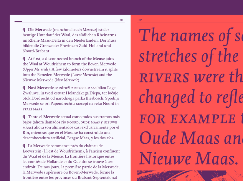 Merwede is not a revival. Many of its features are unconventional and unique. They stem from Schulz’s dissatisfaction with details in classic book typefaces, like italic capitals. (In Merwede, the italic capitals stand one degree more upright than the lowercase so they don’t appear to lean against the lowercase.) References and inspiration have been early Renaissance typefaces and the work of typographers and type designers such as Pierre Simon Fournier, Eric Gill, Jan van Krimpen, Helmut Salden and Martin Majoor, without following any particular model.